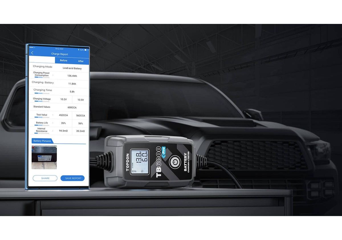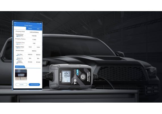 Το TOPDON TB6000Pro προσφέρει για πρώτη φορτά στον κλάδο λειτουργία έξυπνης φόρτισης, η οποία μπορεί να εμφανίσει μια αναφορά πριν και μετά τη λειτουργία παρουσιάζοντας ακριβή σύγκριση δεδομένων. Στη λειτουργία έξυπνης φόρτισης, το TB6000Pro θα εκτελέσει αυτόματα μια προανίχνευση της μπαταρίας μόλις ξεκινήσετε να τη φορτίζετε και θα σας επιτρέψει να δοκιμάσετε ξανά την μπαταρία με τη λειτουργία «Προβολή αναφοράς» για να δημιουργήσετε μια αναφορά πριν και μετά. Συγκρίνοντας τα δεδομένα, όπως CCA, εσωτερική αντίσταση, τάση, κατάσταση εύρυθμης λειτουργίας, η αναφορά δείχνει σαφώς πόσο βελτιώθηκε η μπαταρία μετά τη φόρτιση. Μπορείτε επίσης να αποθηκεύσετε τις αναφορές δοκιμών σε φωτογραφίες για προβολή ανά πάσα στιγμή.